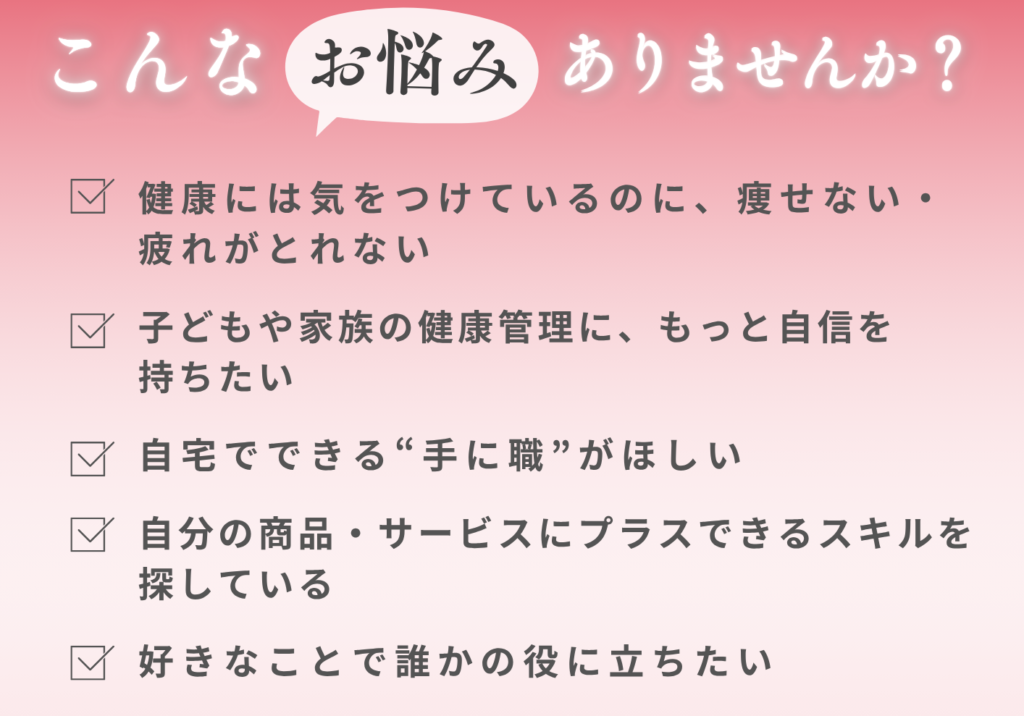 | 子どもや家族の不調に「どう対応すればいいの?」と不安 | 食事・生活習慣の見直しができて、「お母さん頼れるね」と言われるように! |